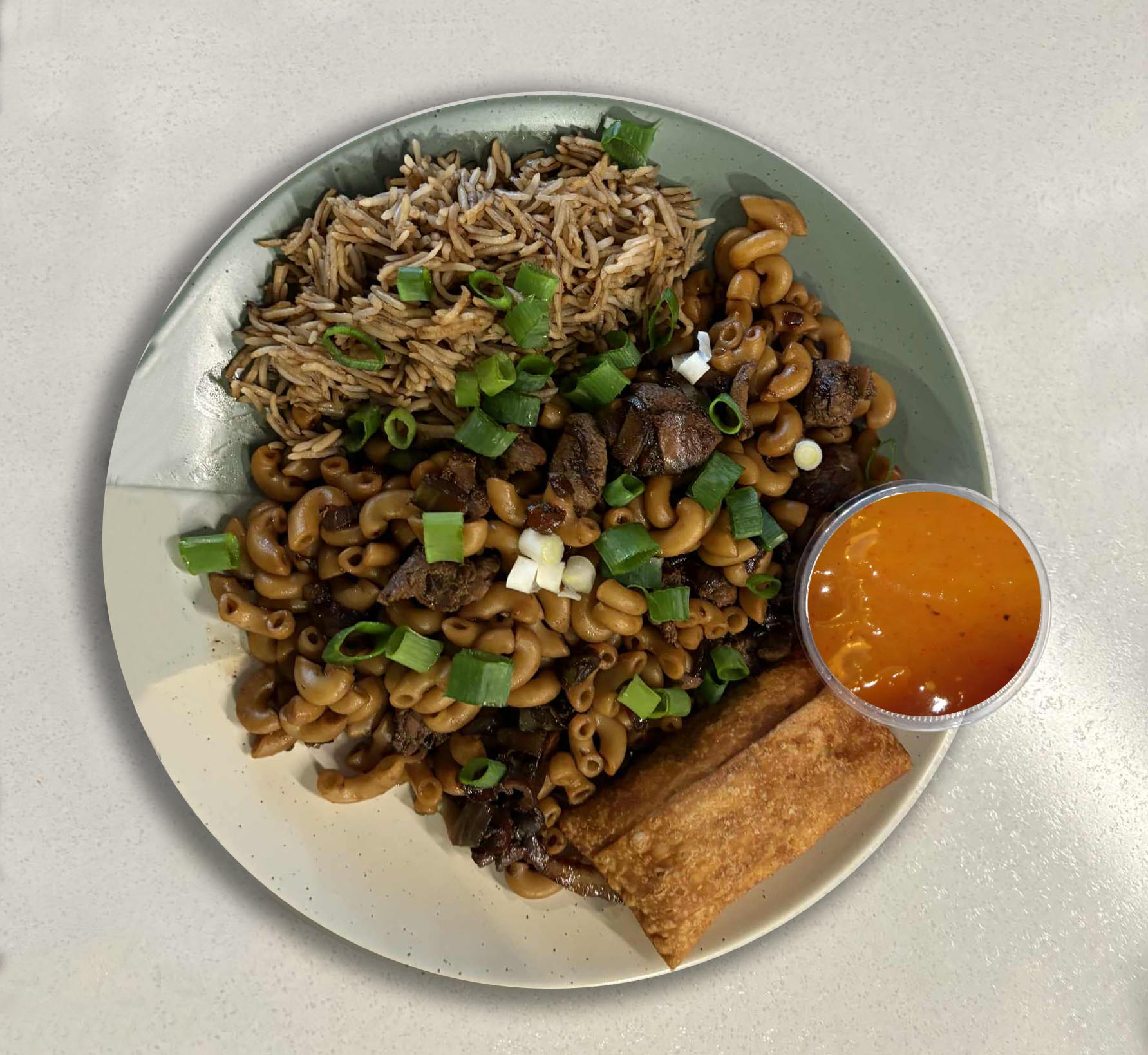 Nouilles au porc, riz, egg roll et sauce aux prunes