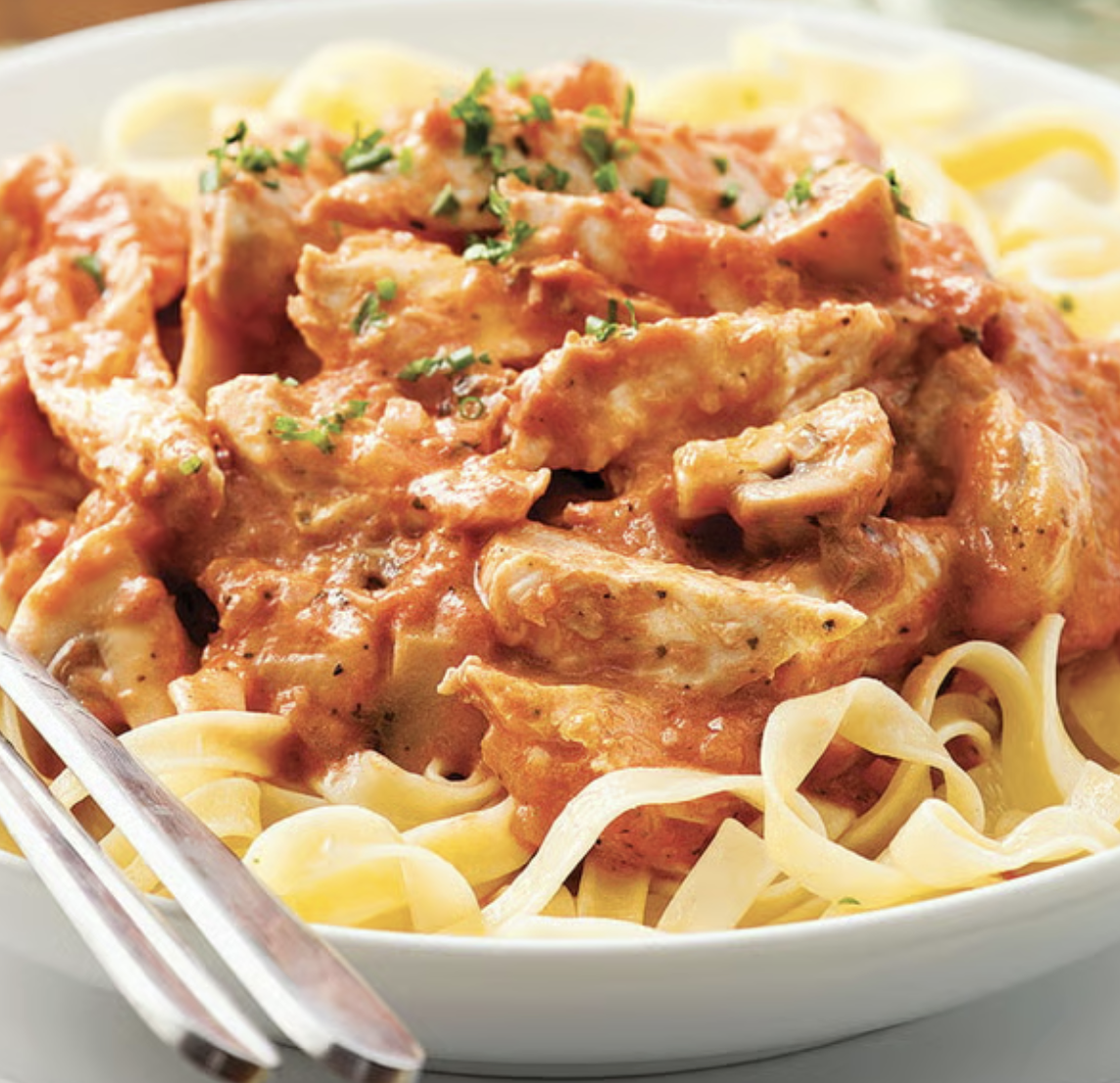 Morceaux de poulet et champignons dans une onctueuse sauce à la crème et à la tomate.